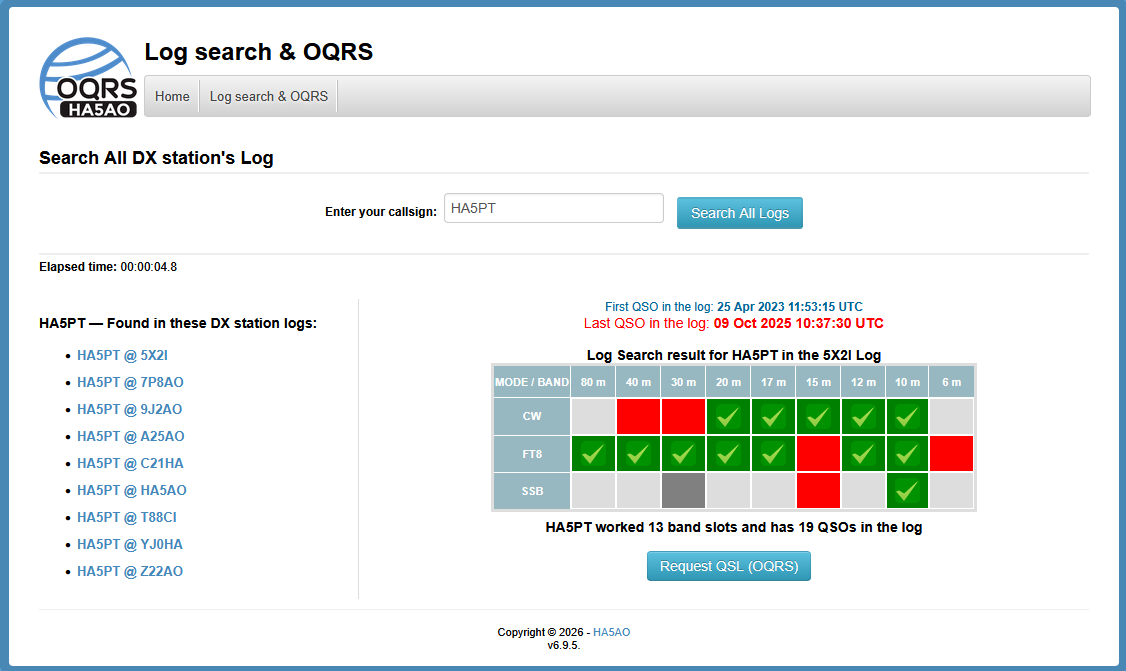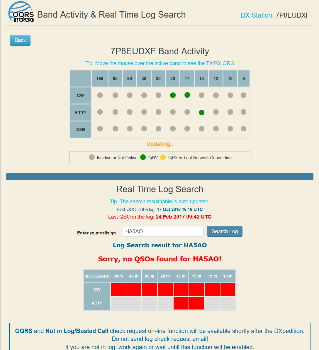 OQRS and Not in Log/Busted Call check request on-line function is available when it is enabled by the DXpedition. Pay attention to the time stamp of the Last QSO in the log. If you are not in log, work again or wait until the Log check request function is enabled.