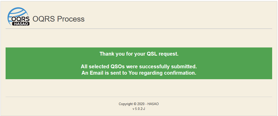 When the transaction is succesfull you will see the Thank you page and an email is sent to you with the details of claimed QSOs. Your QSOs marked for processing the QSL in the database. Check it in the log search result window moving the cursor over the green marks. You should see "Print queue"