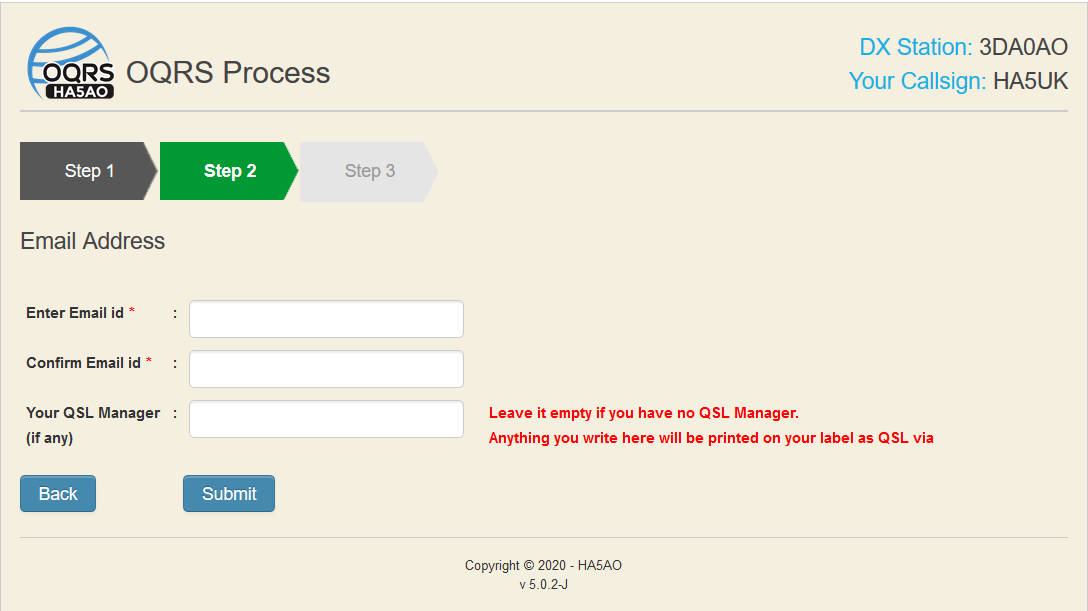 On the Step 2 you are asked for your email address if you selected bureau card. Do not write anything in the QSL manager field if you have no QSL manager. Write the QSL manager callsign if you want your QSL sent to you manager.