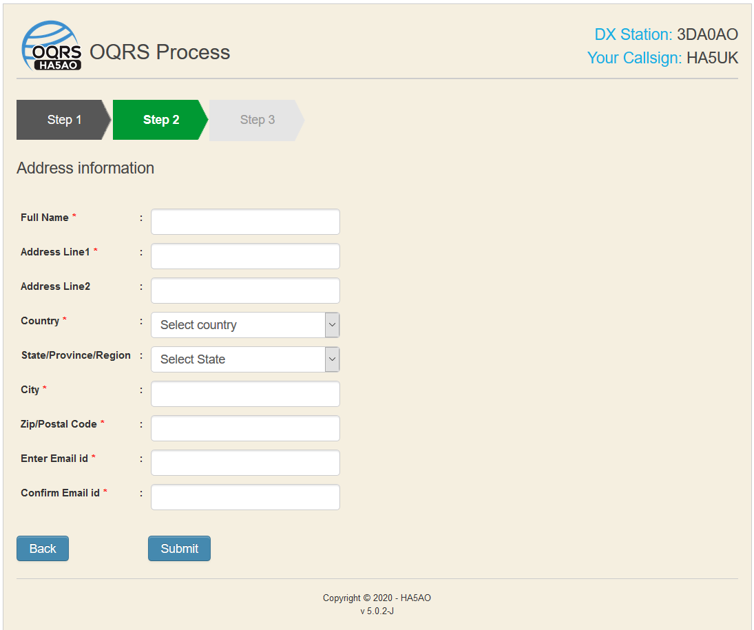 Also in Step 2, the direct QSL card will be posted to the address you write here. The Country list and the State/Province/Region list, where applicable, are interactive. Just start to type the name and select it from the filtered list.